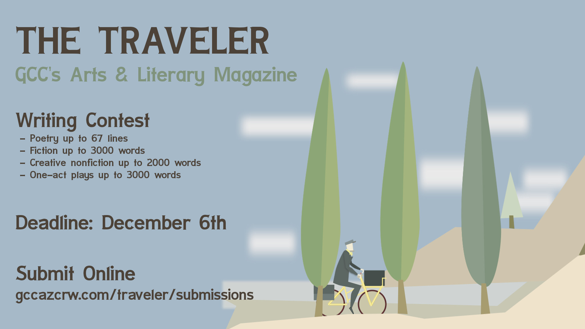 The Traveler, GCC’s Arts & Literary Magazine, is now open for submissions! We accept original works of fiction, poetry, creative nonfiction, and drama from registered GCC students. To submit, head here: Submissions Page.