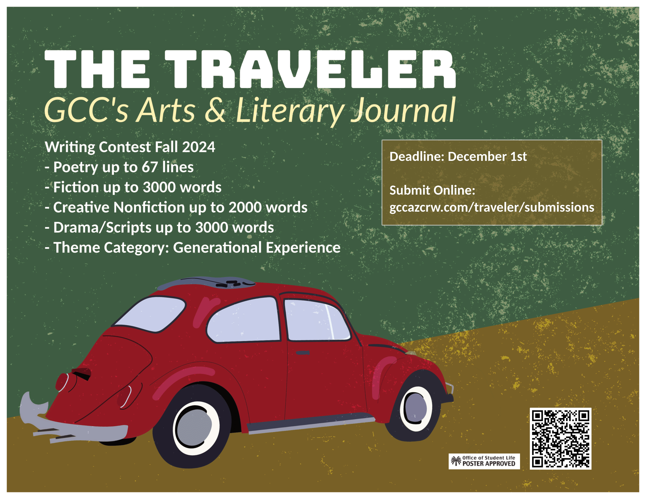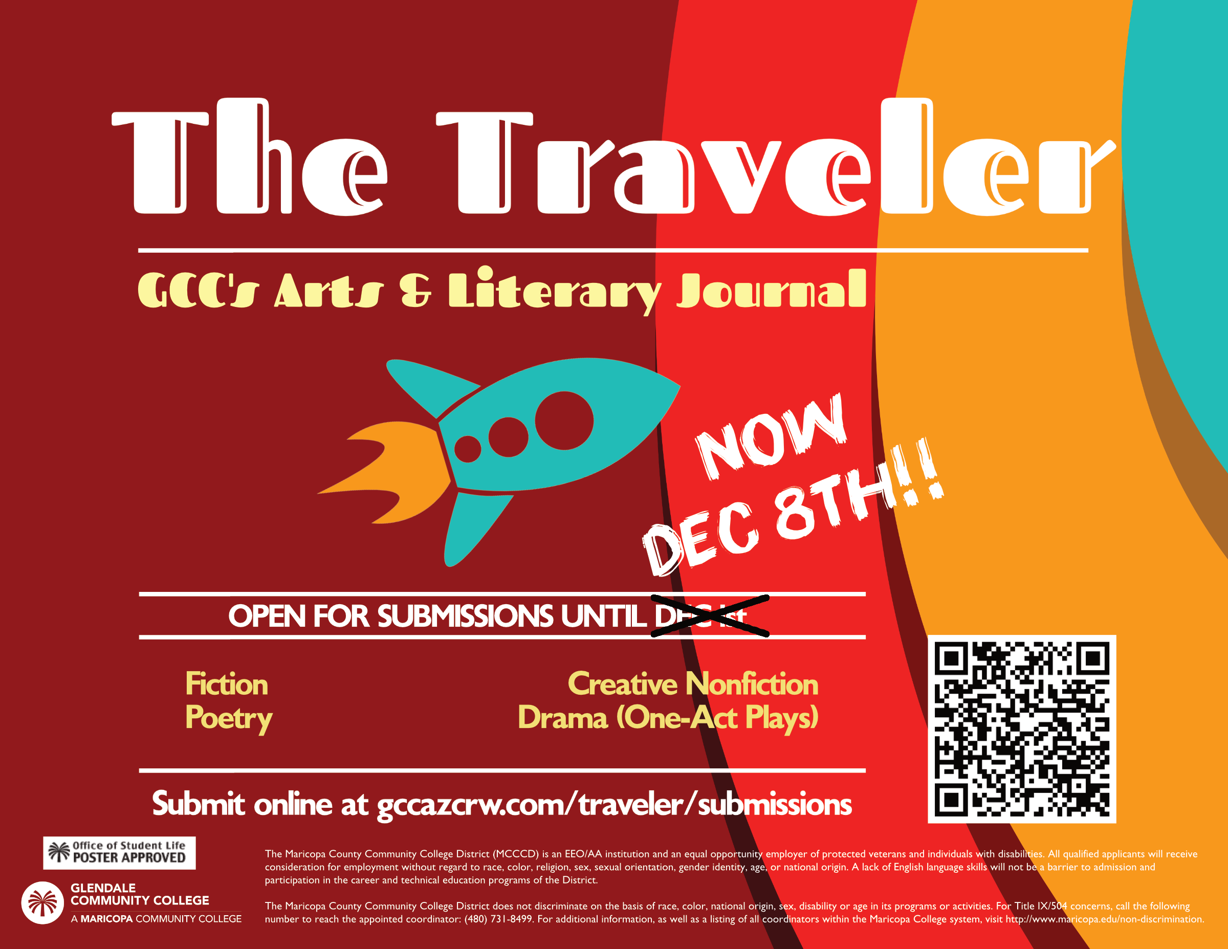 We’re still accepting Traveler submissions. The new deadline is Friday, December 13th. As you wind down your semester, please consider submitting your creative works of fiction, poetry, nonfiction, and plays/screenplays! Submit your work here: https://gccazcrw.com/traveler/submissions/